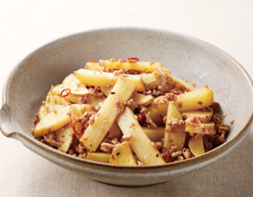 2025年春旬ごはん、新じゃが、新じゃがいも、じゃがいも、ジャガイモ、馬鈴薯、バレイショ、ひき肉、豚ミンチ、豚ひき肉、豚肉、ピリ辛