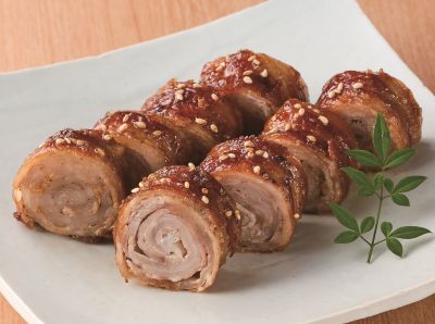 同様に豚肉を重ねて並べ、塩、こしょうをふり、1を芯にして巻き太くする。