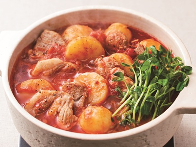 鍋に油とにんにくを入れて弱火にかけ、香りがでたらトマト水煮缶を加えてつぶしながら中火で炒め、豚肉、じゃがいもを加える。