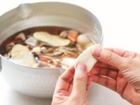 1のだんごを指を水で濡らしながら平たく伸ばし、ちぎって3に加える。だんごに火が通ったら、白ねぎを加える。
